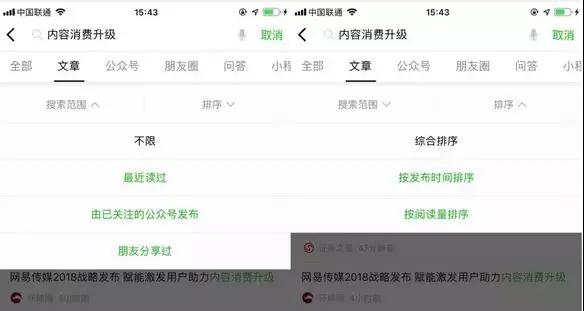 4月,微信搜索进行了一次大更新,接入包括搜狗、知乎、微信读书等更多的内容来源,同时把搜索结果细分为公众号、朋友圈、文章、小程序等10种类型,并依照卡片的方式进行了分类展示。